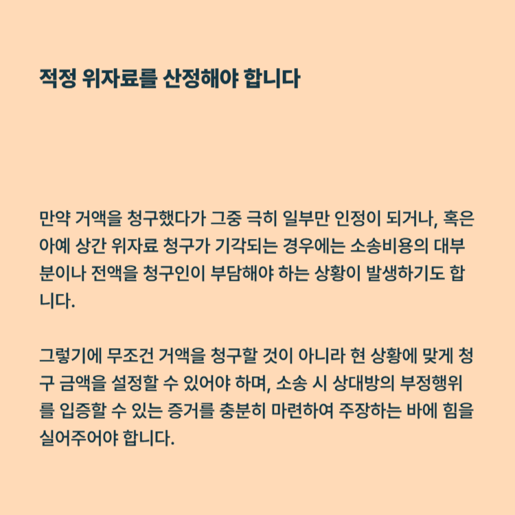 만약 거액을 청구했다가 그중 극히 일부만 인정이 되거나, 혹은 아예 상간 위자료 청구가 기각되는 경우에는 소송비용의 대부분이나 전액을 청구인이 부담해야 하는 상황이 발생하기도 합니다. 그렇기에 무조건 거액을 청구할 것이 아니라 현 상황에 맞게 청구 금액을 설정할 수 있어야 하며, 소송 시 상대방의 부정행위를 입증할 수 있는 증거를 충분히 마련하여 주장하는 바에 힘을 실어주어야 합니다.