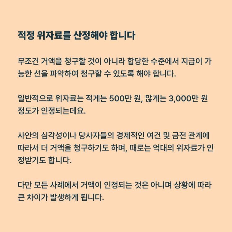 만일 배우자와 상간자에게 위자료를 받아내고자 한다면, 무조건 거액을 청구할 것이 아니라 합당한 수준에서 지급이 가능한 선을 파악하여 청구할 수 있도록 해야 합니다. 일반적으로 위자료는 적게는 500만 원, 많게는 3,000만 원 정도가 인정되는데요. 사안의 심각성이나 당사자들의 경제적인 여건 및 금전 관계에 따라서 더 거액을 청구하기도 하며, 때로는 억대의 위자료가 인정받기도 합니다. 다만 모든 사례에서 거액이 인정되는 것은 아니며 상황에 따라 큰 차이가 발생하게 됩니다.