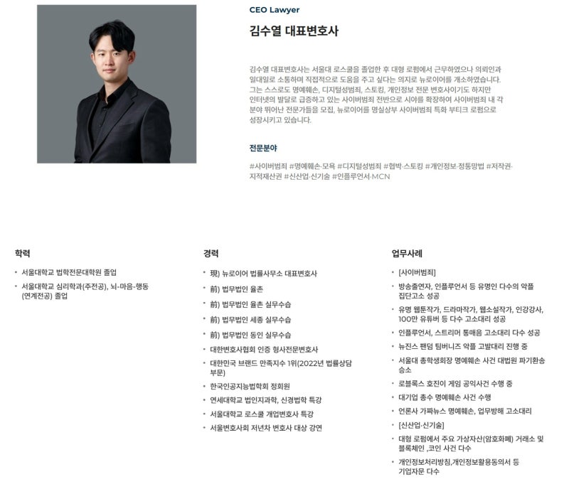 뉴로이어 법률사무소 김수열 대표변호사입니다.