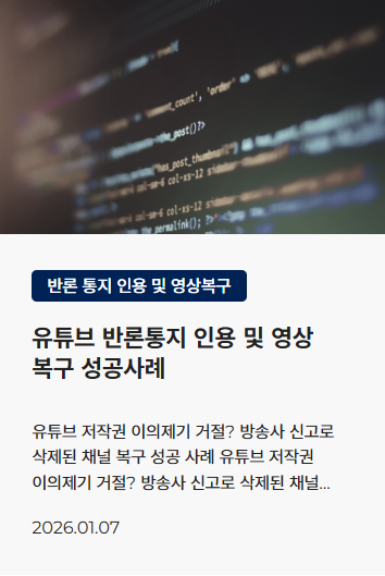 유튜브 저작권 반론통지는 한 번 거절당하면 다시 뒤집기가 매우 어렵기에, 첫 단추를 어떻게 끼우느냐가 채널의 생사를 가릅니다. 지금 경고 누적으로 인한 채널 삭제 공포에 떨고 계신다면, 더 이상 혼자 고민하며 골든타임을 허비하지 마세요.