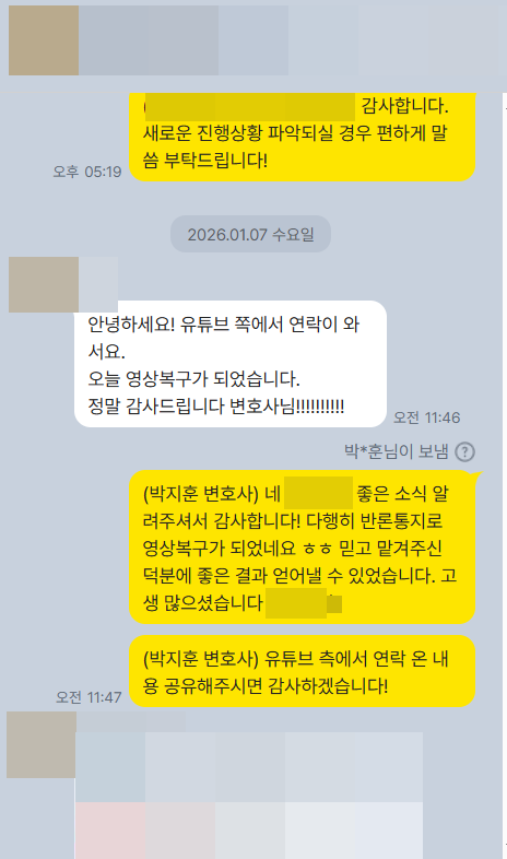 저희가 제출한 서면을 검토한 유튜브 측은 의뢰인의 영상이 유튜브 공정이용 가이드라인에 부합한다고 판단하여 반론통지를 인용했고, 삭제되었던 영상은 즉시 복구되었습니다. 무엇보다 계정 영구 삭제라는 벼랑 끝에서 경고 하나를 방어해 냄으로써, 의뢰인의 소중한 생계수단인 채널을 안전하게 지켜낼 수 있었다는 점이 가장 큰 성과였습니다.