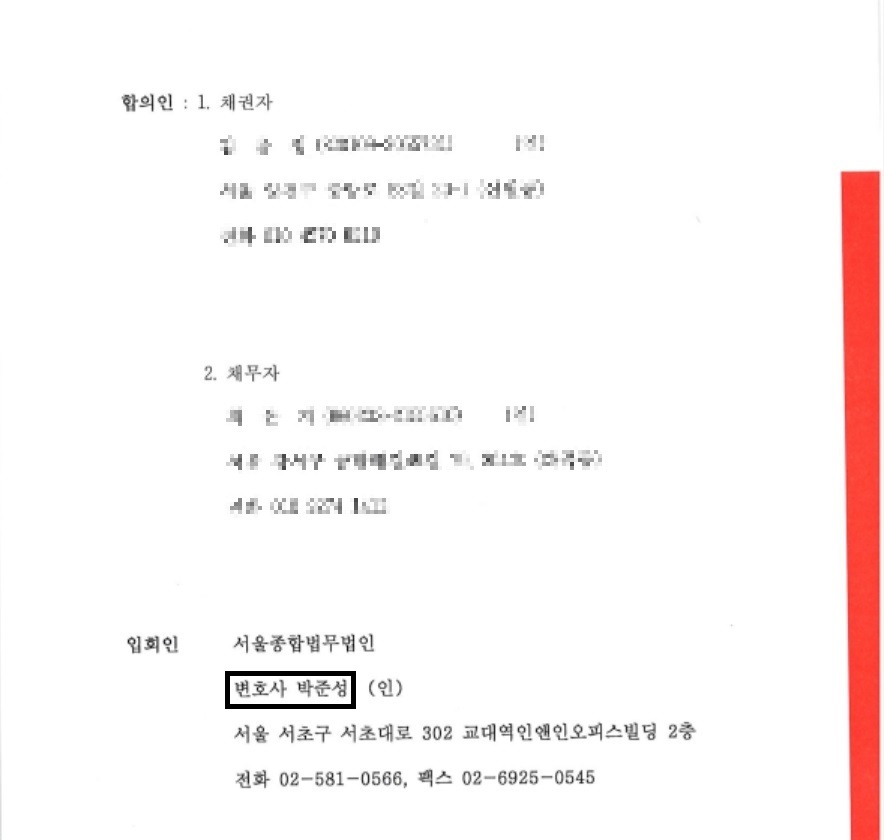 동시에 저 본변호사가 위 합의 내용의 증인이 되는 것으로 입회인 명시를 하였고