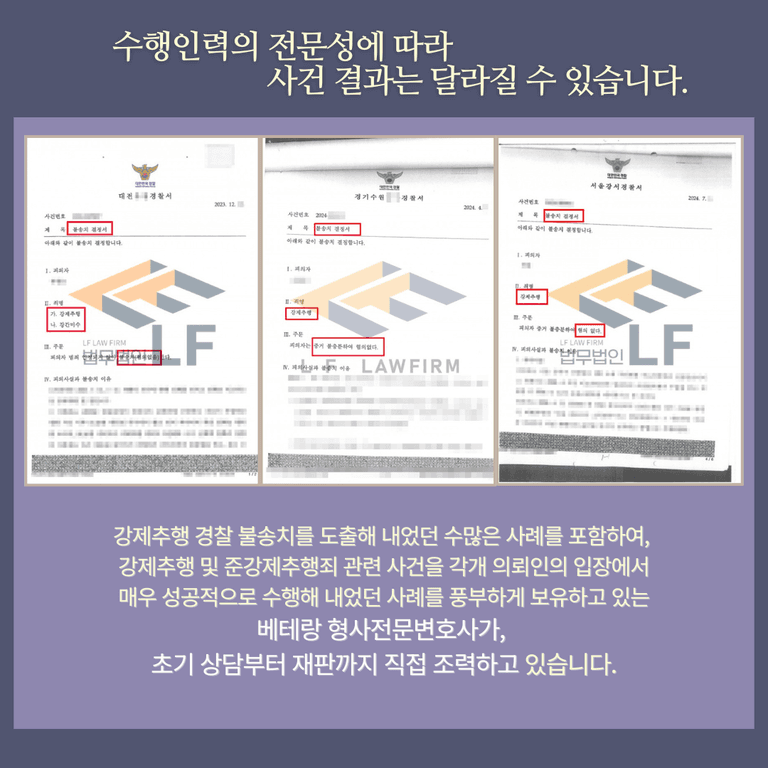변호인의 역량에 따라. 해당 사례의 의뢰인과 같이 경찰 단계에서 경찰불송치 처분을 받으며 상대적으로 조속하게 문제를 마무리 지을 수 있는 경우도 있는 반면, 검찰 단계까지 나아가거나 심지어 강제추행 혐의가 인정되는 상황도 존재할 수 있을 것입니다.