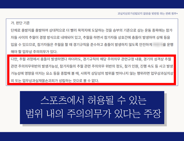 구체적으로는 사고 당시의 주행 속도와 통제 가능성, 진로 변경이나 추월 방식, 코스의 난이도와 혼잡도, 회피 가능성, 안전수칙 위반 여부 등을 종합적으로 고려하여 예견 가능성과 회피 가능성이 있었는지가 판단 기준이 됩니다.