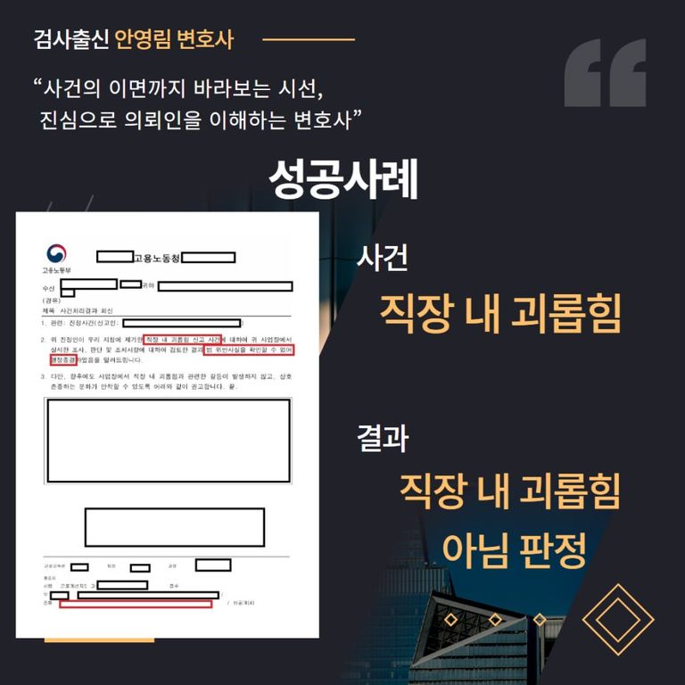 이에 따라 변호사는 법리상 직장 내 괴롭힘 요건에 해당하지 않는다는 결론을 도출했습니다.