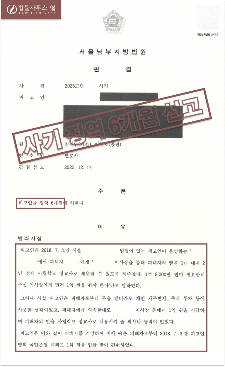 의뢰인은 자녀의 장래를 걱정하는 부모의 절박한 심정을 이용당해, 사립학교 교사 채용을 알선해 주겠다는 말에 속아 1억 원이라는 거액의 금원을 교부하였습니다. 피의자는 자신이 학교법인 이사장과 긴밀한 관계가 있어 채용에 결정적인 영향력을 행사할 수 있는 것처럼 행세하며, 채용 청탁 명목으로 금원을 요구하였습니다.