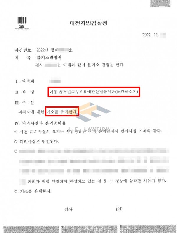 성착취물 소지 혐의에서 기소유예 처분을 도출해 내었던 사례는 물론, 개별적인 상황에 따라 경찰불송치*무혐의 처분을 받았던 사례 등 각개 의뢰인의 입장에서 받아볼 수 있는 최선의 결과를 이끌어 내었던 성공 사례 역시 다수 보유하고 있습니다.