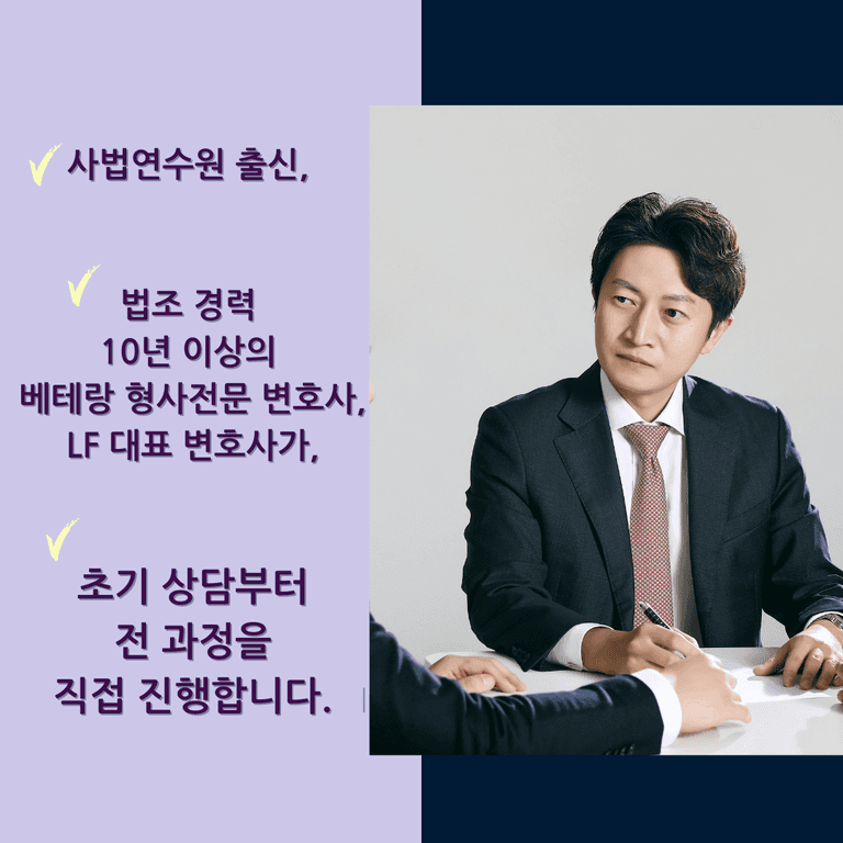 해당 사례의 의뢰인과 같이 어떠한 결과가 돌아올지 확신할 수 없는 불안한 법적 문제를, 효과적으로 또한 효율적으로 가능한 빠르게 해결하기를 원한다면, 관련 사건 해결 경험이 풍부한 베테랑 형사전문 변호인에 도움을 받는 것이 보다 더 유리할 수 있을 것입니다.