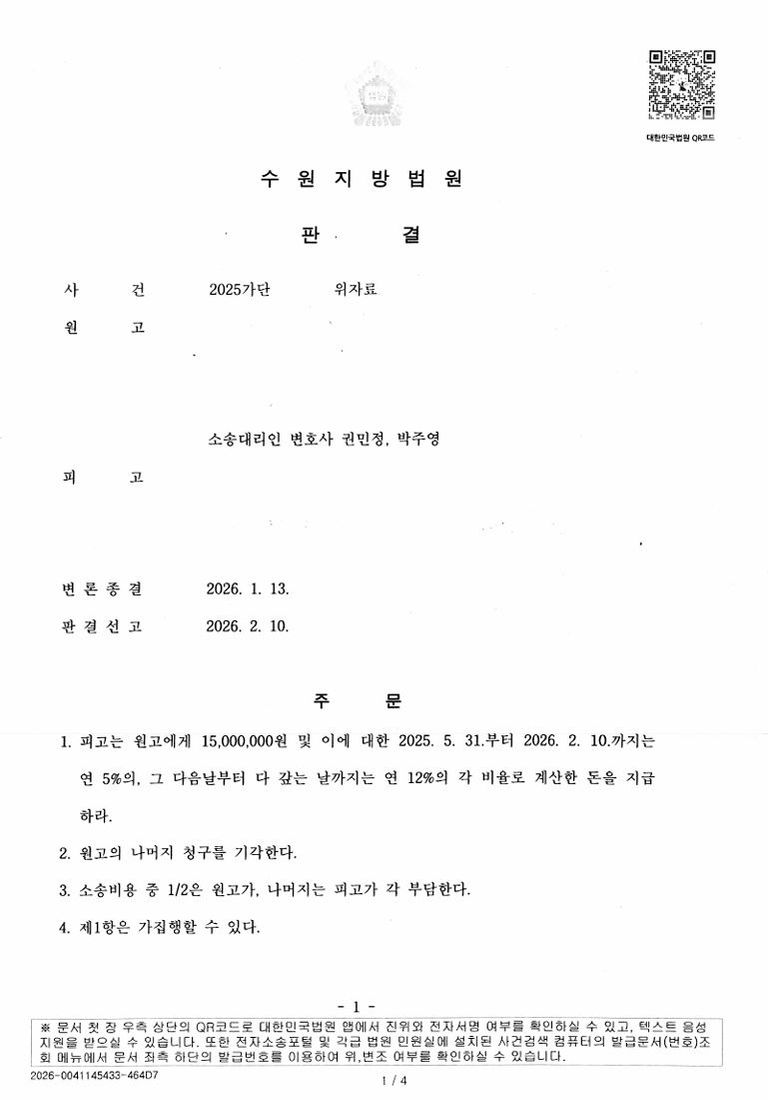 증액을 위해서 요건들에 부합하는 자료들도 충분히 제출하였는데요. 그 결과 법원은 1500만원 인용판결을 선고하였습니다.