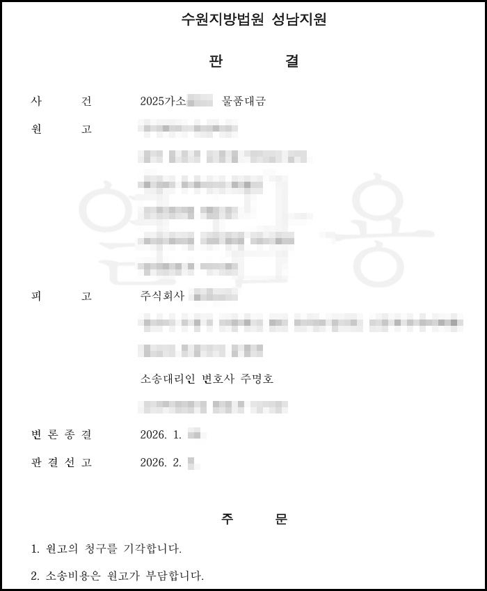 그 결과, 원고의 물품대금 청구는 전부 기각되었습니다.