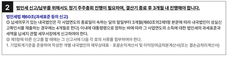정기주주총회를 열지 않아 재무제표 승인이 이루어지지 않으면 법인세 신고 자체가 지연되거나 불가능해질 수 있고, 이 경우 국세기본법에 따라 가산세가 부과될 수 있습니다. 즉, 정기주주총회 미개최는 단순한 회사 내부 절차 문제가 아니라 직접적인 세무 리스크로 연결됩니다.