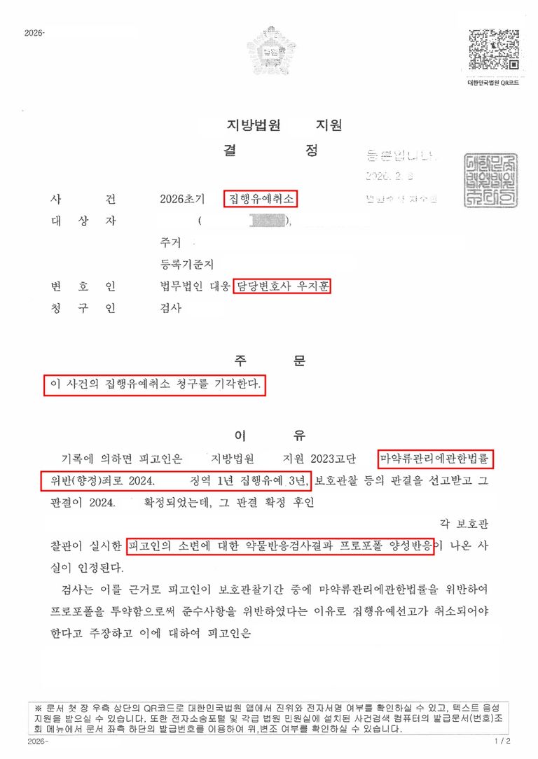 의뢰인은 집행유예 기간 중 보호관찰소에서 진행한 간이시약검사에서 다수의 프로포폴 양성 반응이 확인되어 집행유예 취소에 따른 실형을 살게 될 위기에 처해있었습니다.