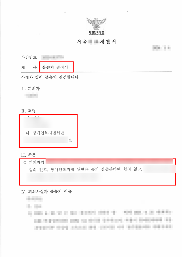 오늘은 장애인복지법 위반 외 3개의 죄명으로 경찰 조사를 받게 되신 의뢰인을 도와드려 불송치를 받아드린 사례를 소개해 드릴까 하는데요.