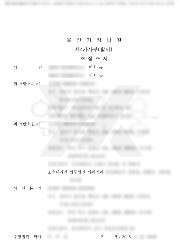 법무법인 YK의 조력으로, 이혼, 자녀의 친권 및 양육권 확보, 부동산 명의이전, 억대의 현금 및 차량 이전 조건으로 임의조정 성립하였습니다.