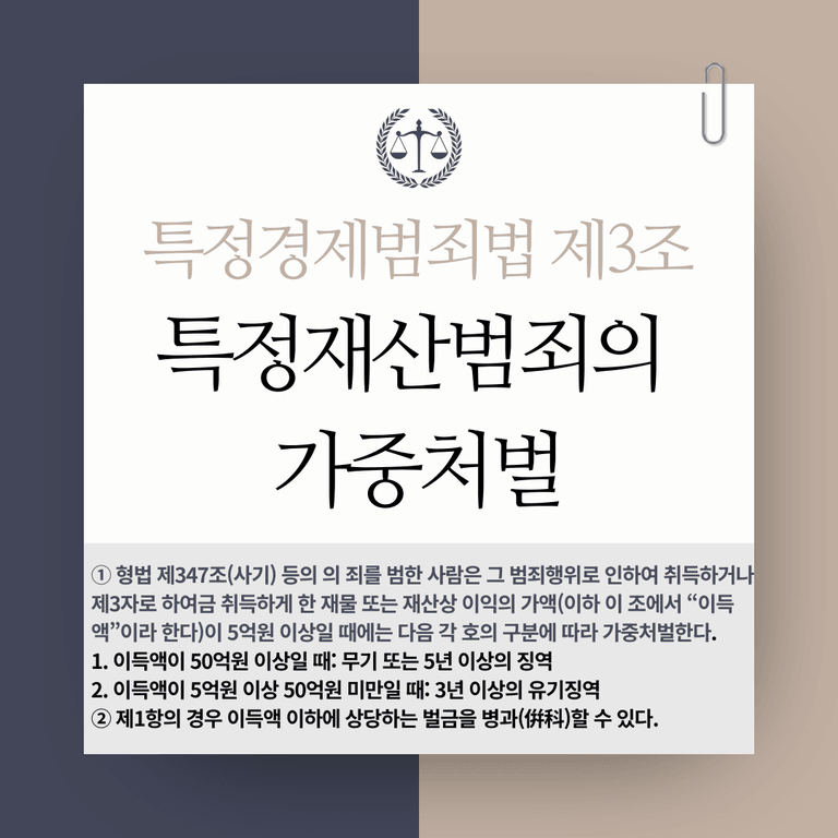 ① 「형법」 제347조(사기), 제347조의2(컴퓨터등 사용사기), 제350조(공갈), 제350조의2(특수공갈), 제351조(제347조, 제347조의2, 제350조 및 제350조의2의 상습범만 해당한다), 제355조(횡령ㆍ배임) 또는 제356조(업무상의 횡령과 배임)의 죄를 범한 사람은 그 범죄행위로 인하여 취득하거나 제3자로 하여금 취득하게 한 재물 또는 재산상 이익의 가액(이하 이 조에서 “이득액”이라 한다)이 5억원 이상일 때에는 다음 각 호의 구분에 따라 가중처벌한다. <개정 2016. 1. 6., 2017. 12. 19.>