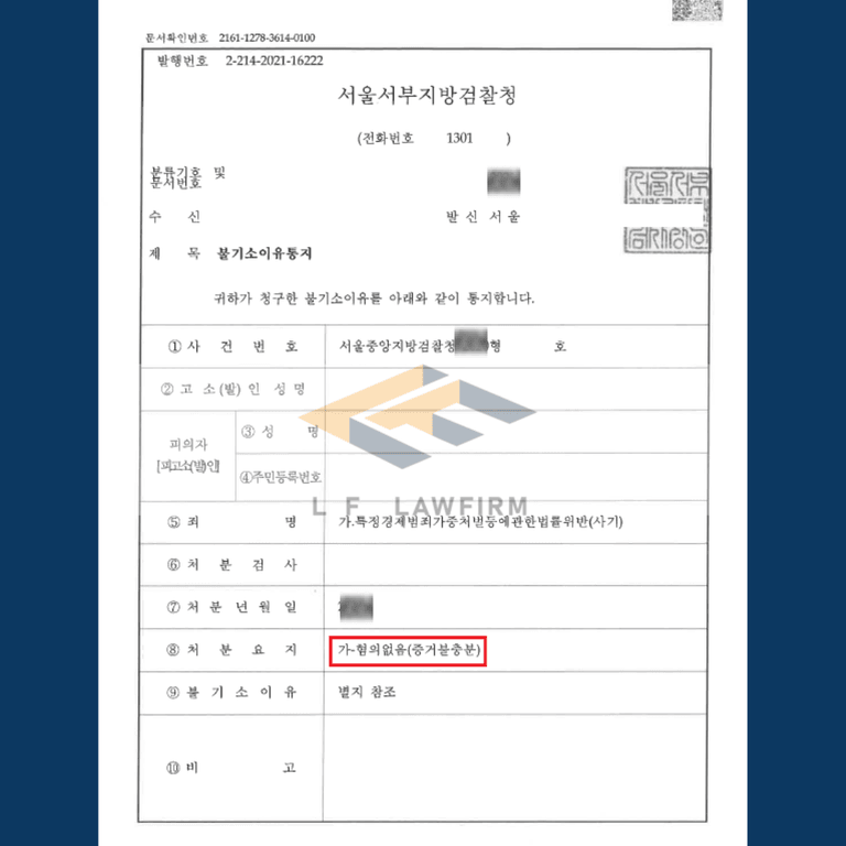 의뢰인은 검찰로부터 혐의없음(증거 불충분) 처분을 받을 수 있었습니다.