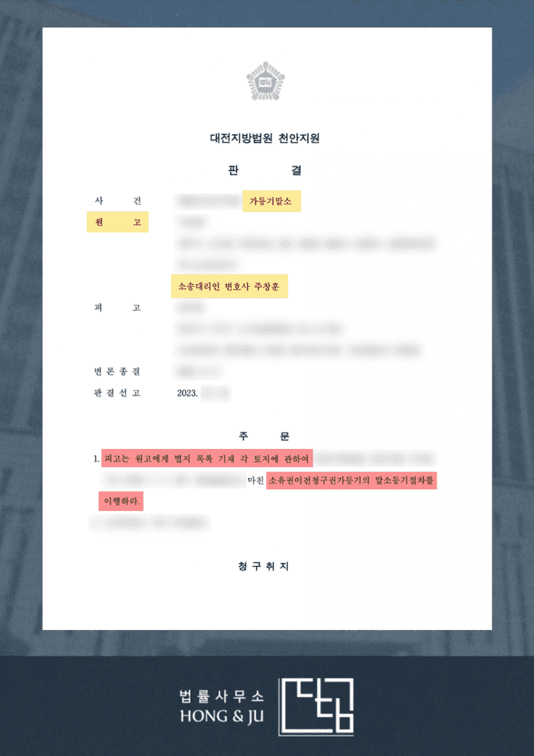 이로써 약 2년 간 진행되었던 가등기말소소송은 주창훈 안산민사전문변호사 조력을 받은 의뢰인이 '승소'한 것으로 종결됐습니다.