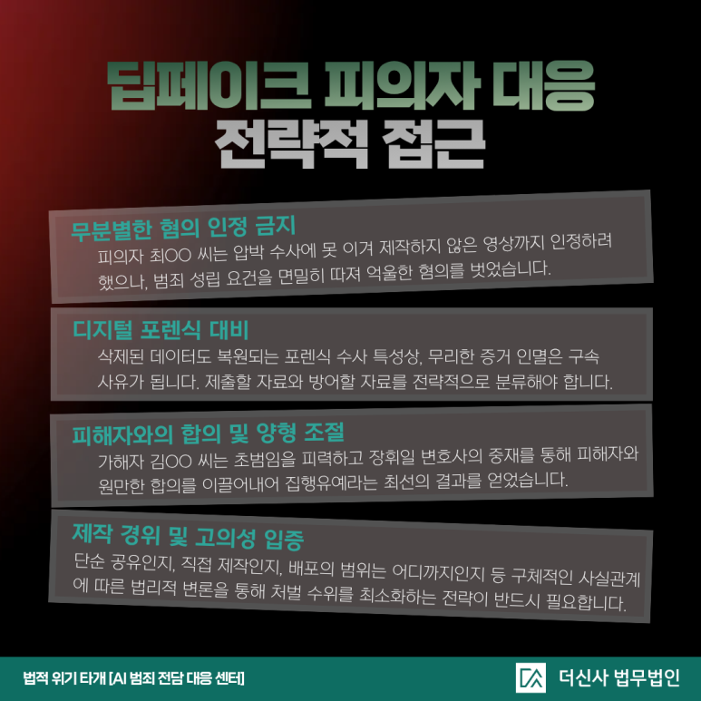 사건의 경위, 소지의 목적, 대상 인물의 연령 인지 여부 등은 처벌의 수위를 결정하는 핵심 요소입니다. 딥페이크 관련 범죄는 단순 호기심이었다는 주장만으로는 선처를 받기 어려운 구조로 변화하고 있습니다.