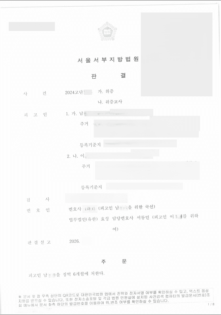 공동피고인은 의뢰인의 교사로 관련 형사사건에서 위증을 하였다며 검찰에 자수하였고 이에 검찰은 의뢰인을 위증교사라며 기소하여 의뢰인은 저를 찾아오셨습니다.