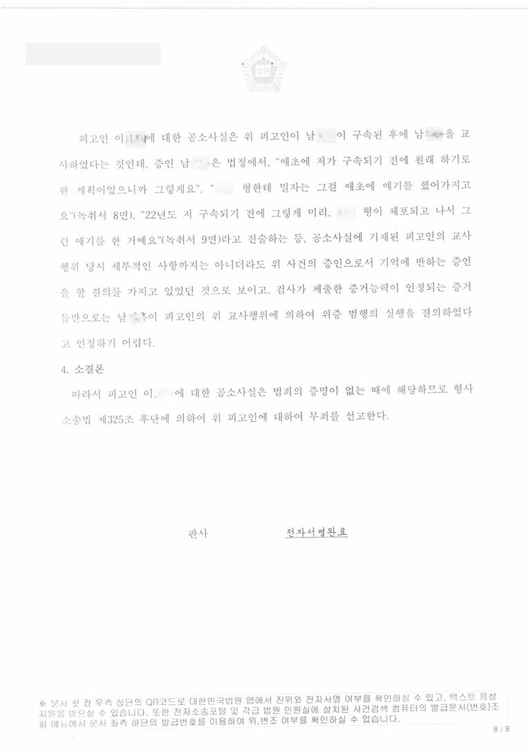 저는 재판 과정에서 사건의 경위, 자수의 경위, 교사행위의 부존재 및 불특정, 공소장 내용의 불특정, 교사범의 성립시기 등을 주장 입증하였고 법원은 의뢰인에게 무죄를 선고하였습니다.