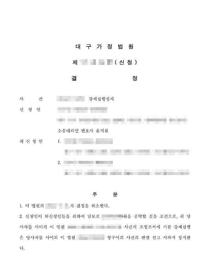 실무적으로 이는 조정조서의 효력을 다투는 본안 소송에서 정당성을 입증하기도 전에, 조정조서 상의 금액 @억 원 전체를 현금으로 법원에 맡겨야만 재산을 지킬 수 있다는 의미였습니다. 대부분의 사람들에게 @억 원, 현금을 즉시 동원하는 것은 불가능에 가깝습니다. 이러한 결정은 소송의 정당성과는 무관하게, 경제적 능력의 유무에 따라 재판받을 권리 자체를 박탈할 수 있는 가혹한 처사였습니다.