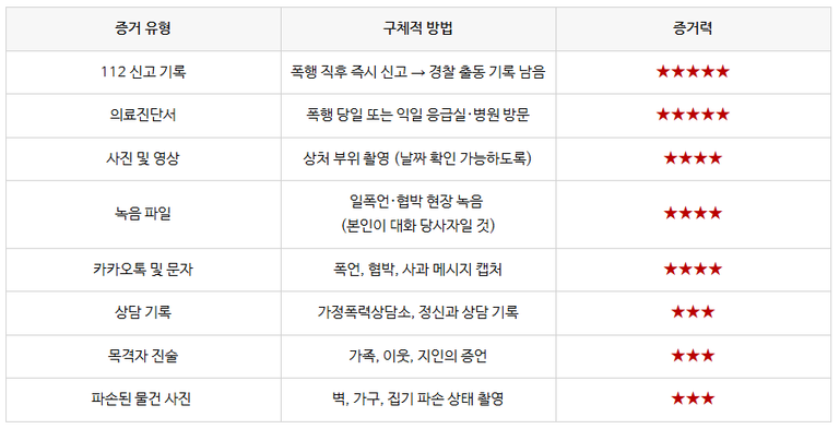 하지만 112 신고 3회 + 진단서 2장 + 폭언 녹음 + 상담 기록이 쌓이면,