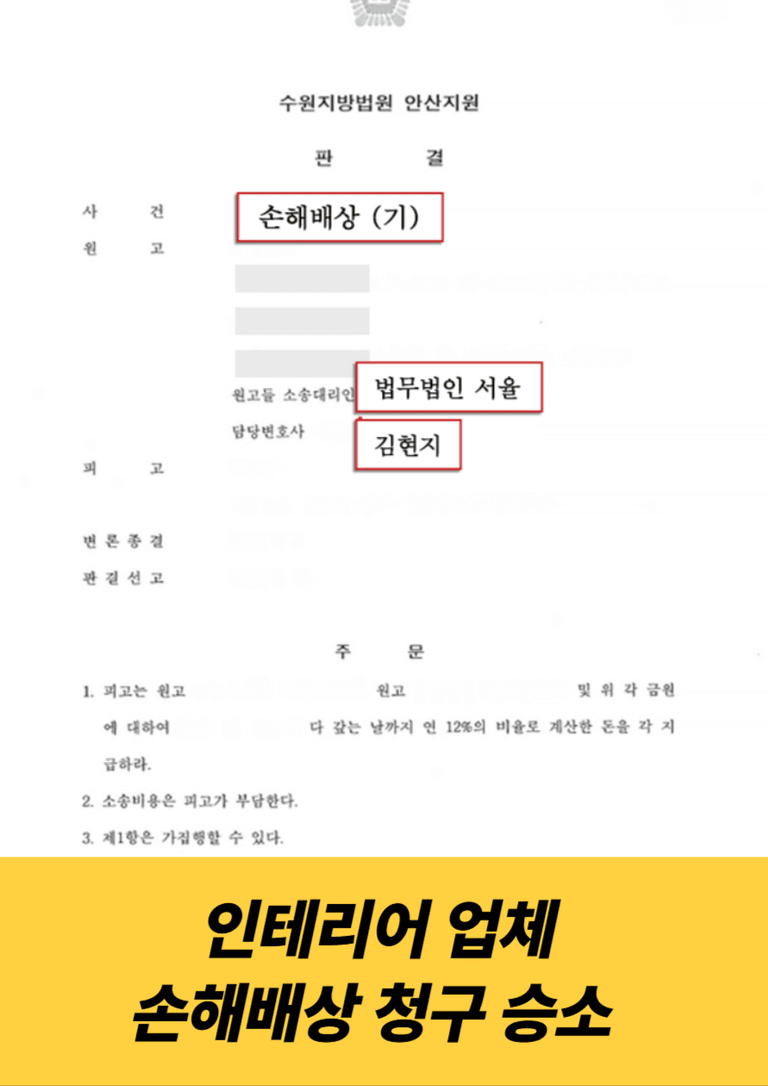 그 결과 피고에게 손해배상금 전액과 이에 대한 연 12%의 지연손해금 지급을 명했고, 소송비용 역시 전액 피고 부담으로 판결했습니다. 의뢰인은 공사비를 회수하고, 월세 및 관리비 손해를 배상받았으며, 재공사 비용 보상과 지연손해금까지 추가로 확보할 수 있었습니다.