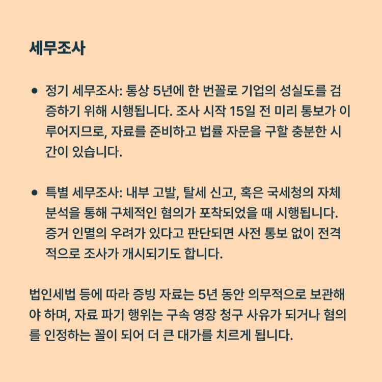 비정기 세무조사(특별 세무조사): 내부 고발, 탈세 신고, 혹은 국세청의 자체 분석을 통해 구체적인 혐의가 포착되었을 때 시행됩니다. 증거 인멸의 우려가 있다고 판단되면 사전 통보 없이 전격적으로 조사가 개시되기도 합니다.