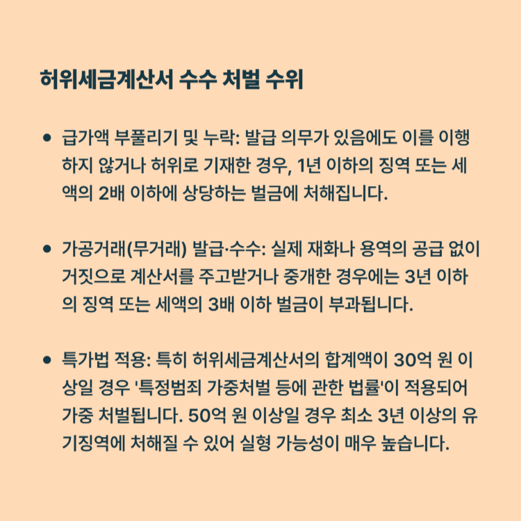 공급가액 부풀리기 및 누락: 발급 의무가 있음에도 이를 이행하지 않거나 허위로 기재한 경우, 1년 이하의 징역 또는 세액의 2배 이하에 상당하는 벌금에 처해집니다.