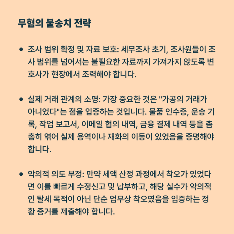실제 거래 관계의 소명: 가장 중요한 것은 "가공의 거래가 아니었다"는 점을 입증하는 것입니다. 물품 인수증, 운송 기록, 작업 보고서, 이메일 협의 내역, 금융 결제 내역 등을 촘촘히 엮어 실제 용역이나 재화의 이동이 있었음을 증명해야 합니다.