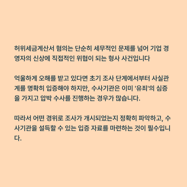 허위세금계산서 혐의는 단순히 세무적인 문제를 넘어 기업 경영자의 신상에 직접적인 위협이 되는 형사 사건입니다. 억울하게 오해를 받고 있다면 초기 조사 단계에서부터 사실관계를 명확히 입증해야 하지만, 수사기관은 이미 '유죄'의 심증을 가지고 압박 수사를 진행하는 경우가 많습니다.
