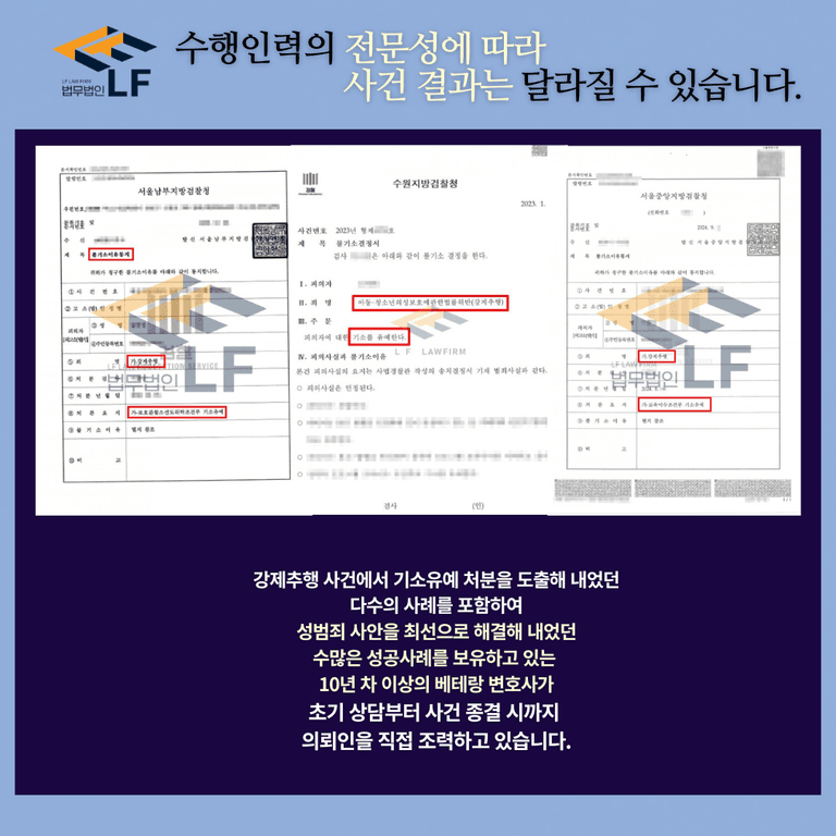 그에 따라, 관련 사안에서 기소유예를 도출해 내었던 사례는 물론 상황에 따라 경찰불송치/무혐의 처분 또는 무죄 판결을 도출해 내었던 사례 역시 다수 보유하고 있습니다.