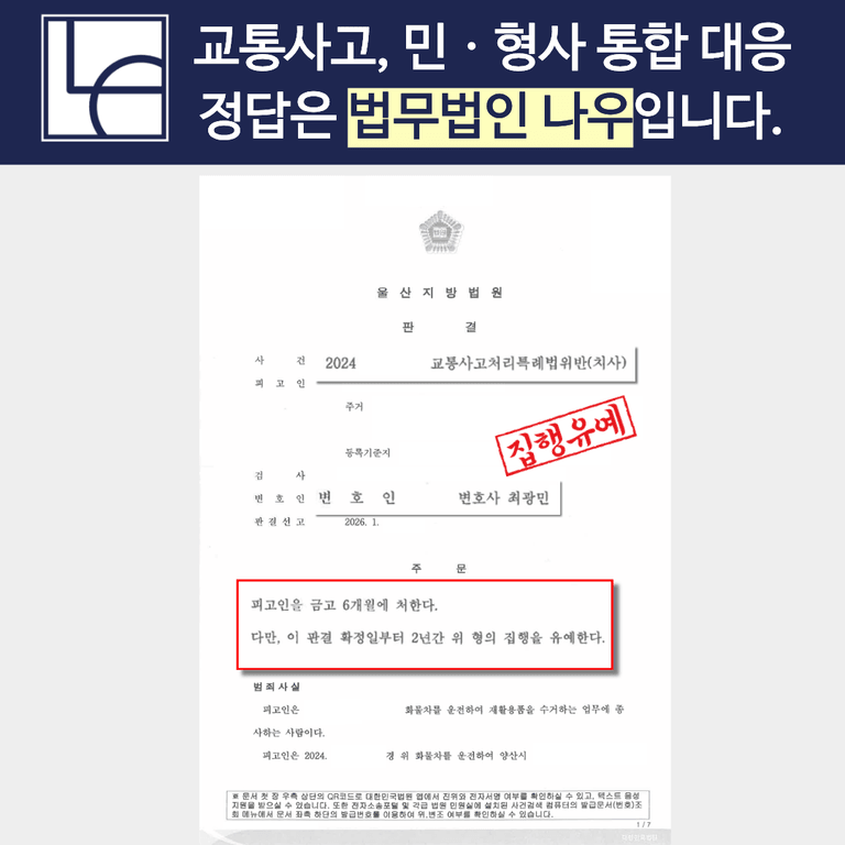 피해자가 교통사고 사망이라는 중한 결과로 인하여 실형 선고의 가능성이 굉장히 높은 사안이었음에도 불구하고, 울산교통사고전문변호사 법무법인 나우의 체계적인 변호 전략을 통해 재판부로부터 [집행유예] 판결을 이끌어낼 수 있었습니다.