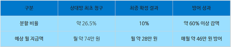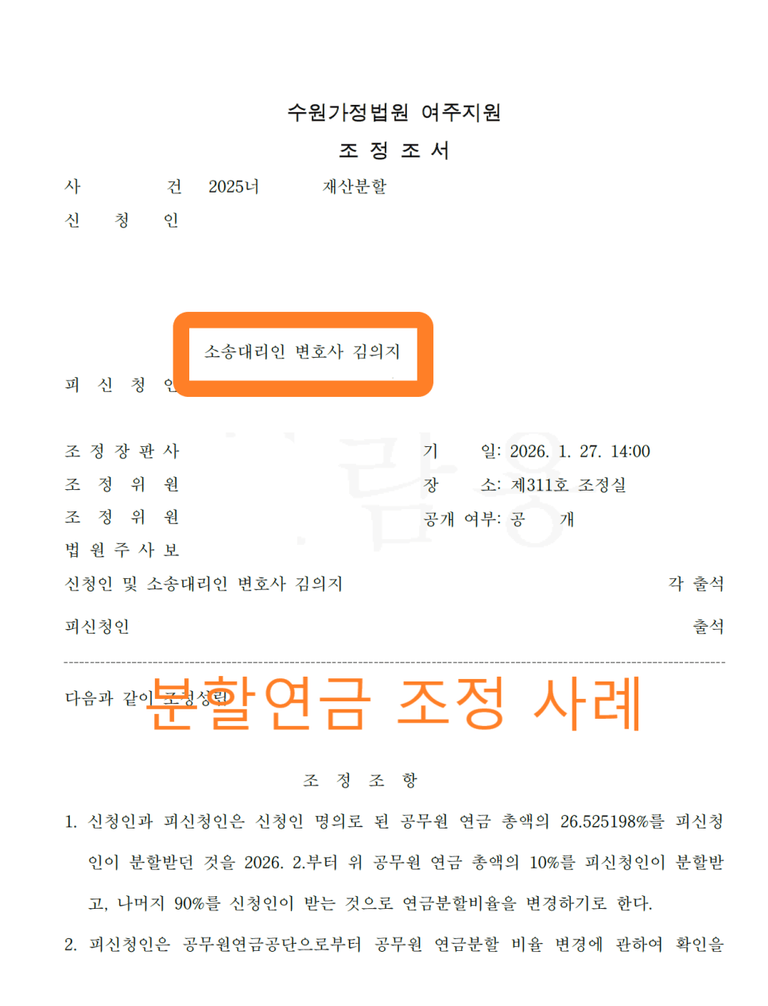 상대방이 요구한 비율은 혼인 기간을 최대로 산정한 약 26.5%(월 수령액 기준 약 74만 원)에 달했습니다. 평생 빚을 갚느라 고생한 의뢰인으로서는 자신의 유일한 노후 생계 수단인 연금마저 큰 폭으로 깎이게 될 위기에 처한 것입니다.
