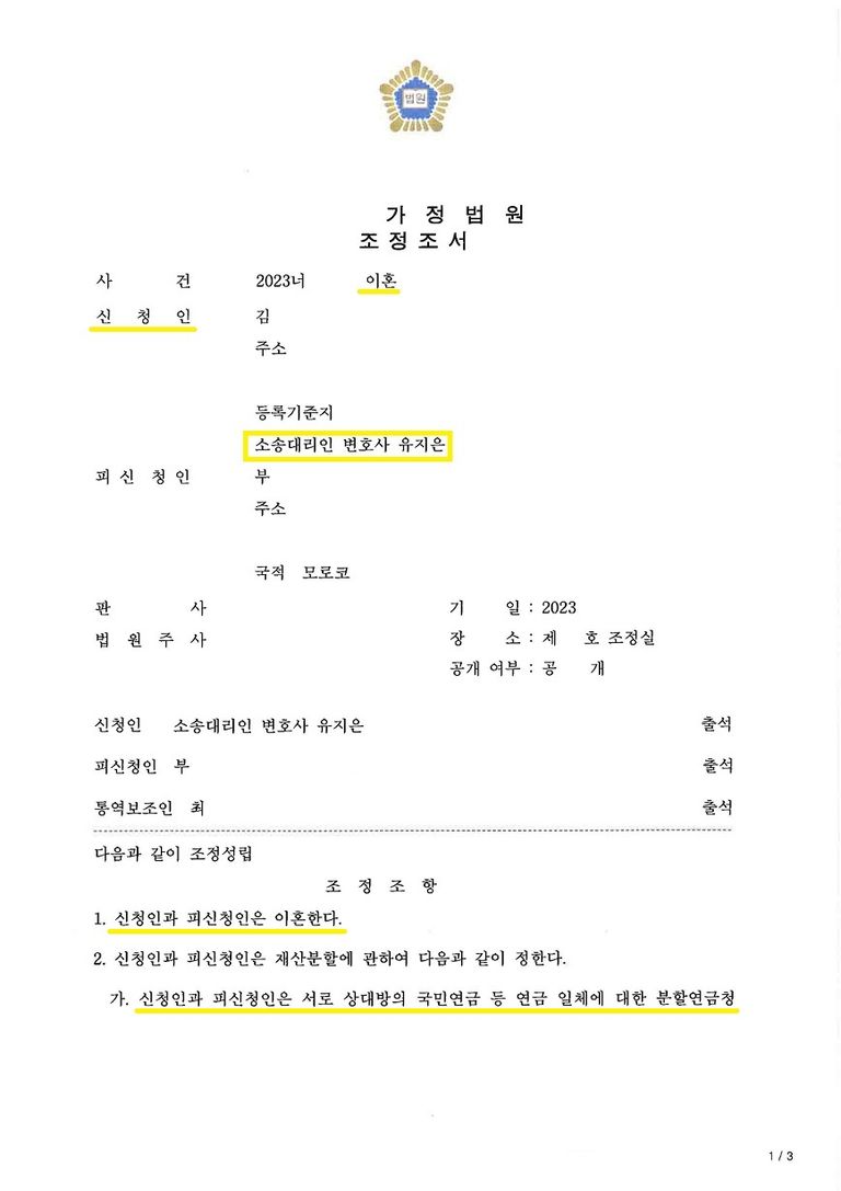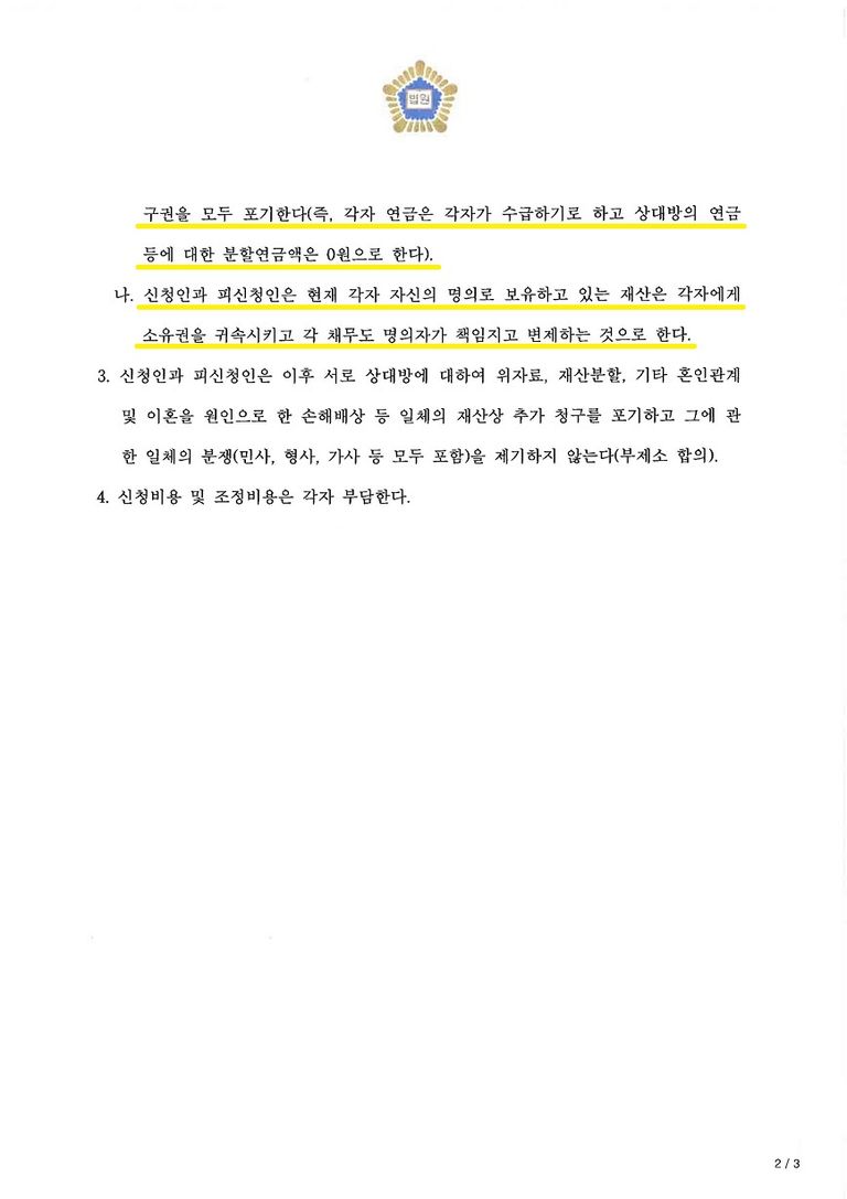 저희는 조정기일에 통역보조인을 대동하여 남편을 적극 설득하였고, 남편이 한국에 재산이 전혀 없었기 때문에 재산분할로 각자 재산 각자 보유하는 것으로 정리하고 상대방이 의뢰인의 연금에 대해서도 청구할 수 없도록 분할연금청구권 포기 조항도 넣어 달라고 요구하였습니다.