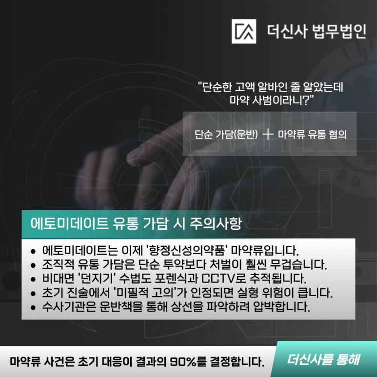결국 조직의 꼬리로 잡힌 상황에서 이러한 약물의 법적 특성을 제대로 파악하지 못한 채 방어에 나선다면, 모든 유통 책임을 홀로 짊어지게 될 위험이 큽니다.