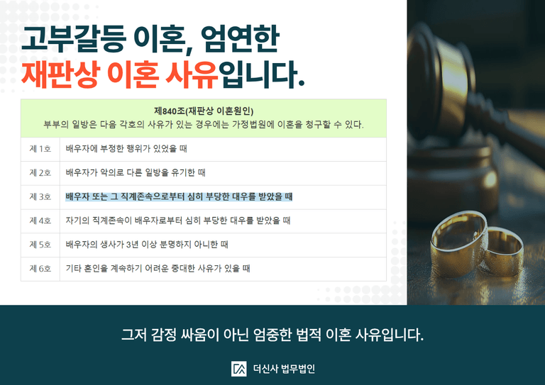 단순한 성격 차이나 고부간의 사소한 말다툼만으로는 재판상 이혼이 어렵습니다. 민법 제840조 제3호가 정한 '배우자 또는 그 직계존속으로부터 심히 부당한 대우를 받았을 때'에 해당해야 합니다.