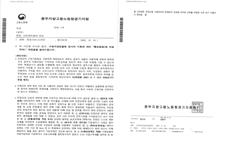 노동청은 변호인의 법리적 주장과 제출 자료를 종합 검토한 결과, 진정인을 근로기준법상 근로자로 보기 어렵다고 판단하고 행정종결(법 적용 제외) 처분을 내렸습니다. 그 결과 의뢰인은 퇴직금 미지급 책임을 부담하지 않고, 민·형사상 어떠한 책임도 없이 사건을 종결할 수 있었습니다.