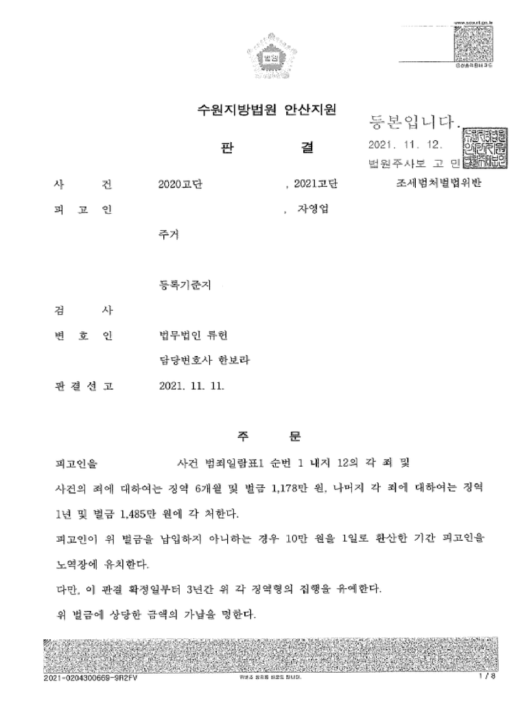 재판부는 변호인의 전략과 의뢰인의 적극적인 자수·납세 조치를 받아들여, 의뢰인에게 징역형과 벌금형의 일부를 집행유예로 선고하였습니다. 이 사건은 조세범죄 사건에서 자수와 미납세금 정산, 정산변론을 통한 법리적 대응이 실제로 형량 경감에 큰 영향을 줄 수 있음을 보여주는 사례입니다.