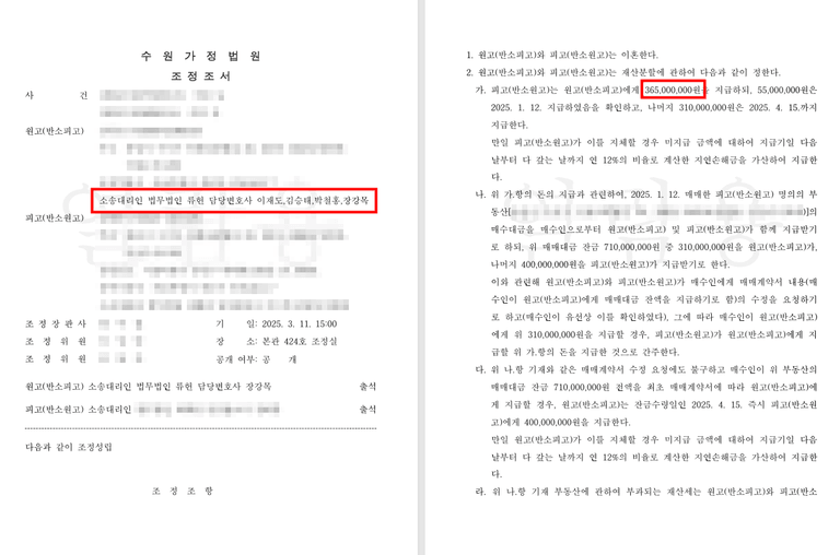 변호인은 혼인 파탄의 주된 책임이 상대방에게 있다는 점을 명확히 주장하며, 의뢰인의 재산분할 권리를 최대한 유리하게 이끌기 위해 전략적으로 대응했습니다. 사건 진행 중 의뢰인과 상대방 간 합의 의사가 확인되었고, 이를 바탕으로 조정합의서를 제출하여 이혼 및 재산분할에 관한 조정이 성립되도록 하였습니다.