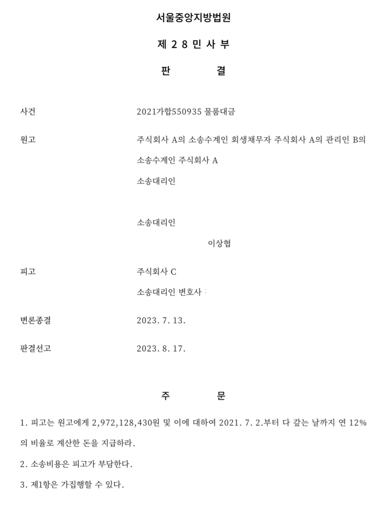 그런데 피고는 물품대금 중 4억 원만을 지급한 채 나머지 29억 7,212만 8,430원의 지급을 거부하였고, 이에 원고는 서울중앙지방법원에 물품 대금 청구 소송을 제기하게 되었습니다.