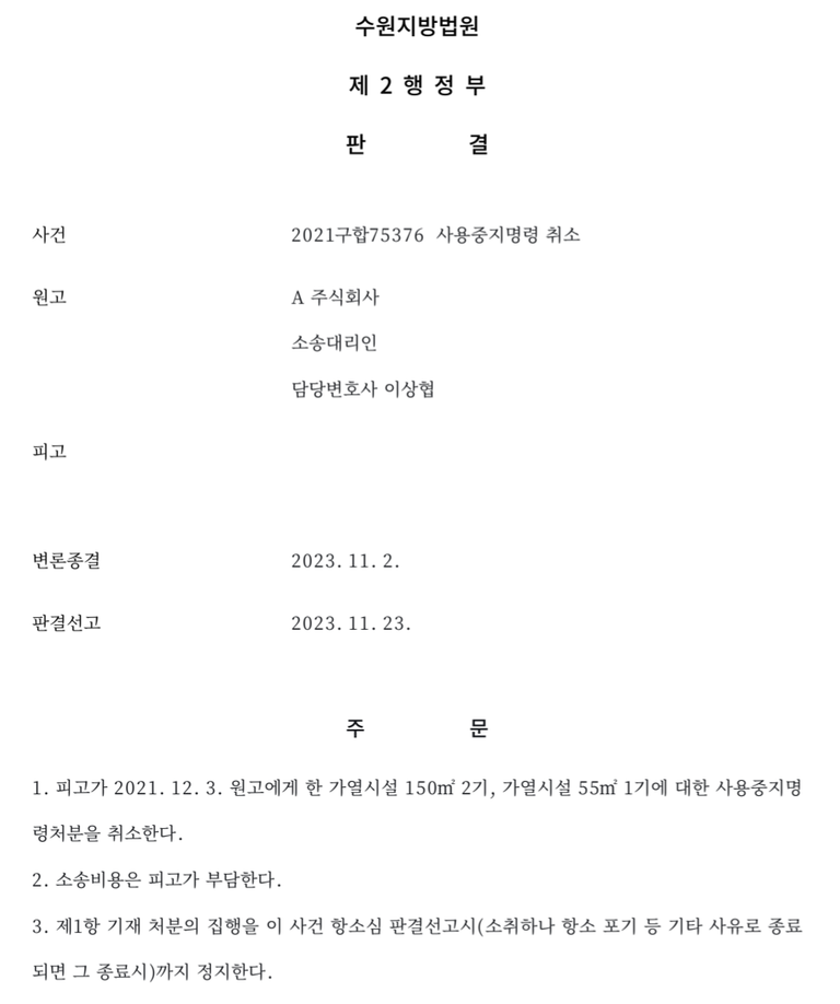 아울러 법원은 항소심 판결 선고 시까지 처분의 집행정지도 함께 결정하여, 원고가 판결 확정 전이라도 정상적인 공장 가동을 계속할 수 있도록 하였습니다.
