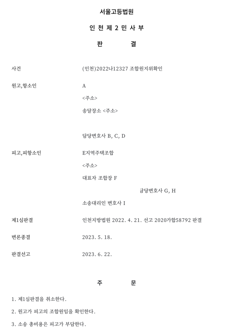 서울고등법원(인천)은 원고의 주장을 받아들여, 제1심 판결을 전부 취소하고 원고가 피고 조합의 조합원임을 확인하는 판결을 선고하였습니다.