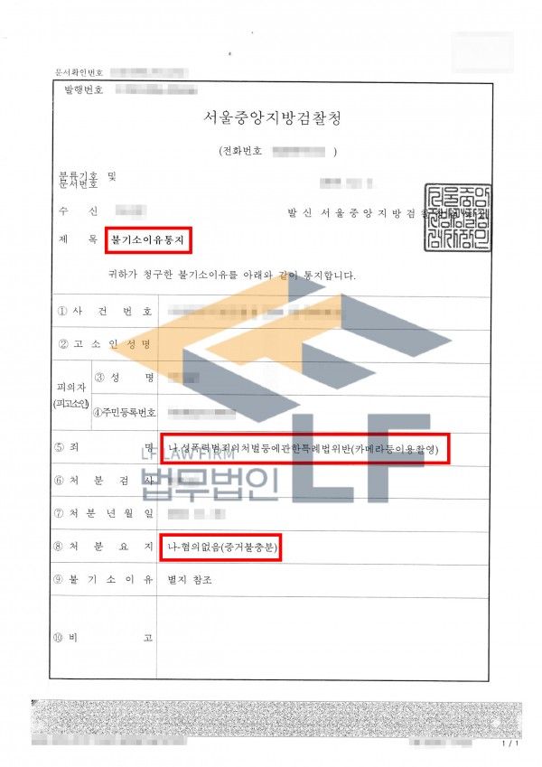 검찰에서는 본 변호인의 의견을 수용하여 의뢰인에 혐의없음(증거불충분) 처분을 내렸습니다.