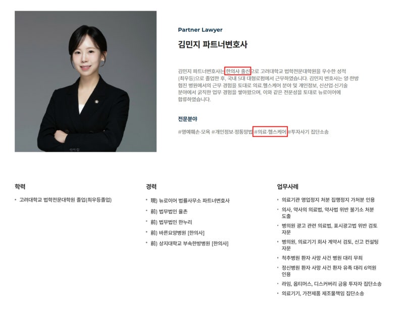 뉴로이어 법률사무소 한의사출신 김민지변호사입니다.