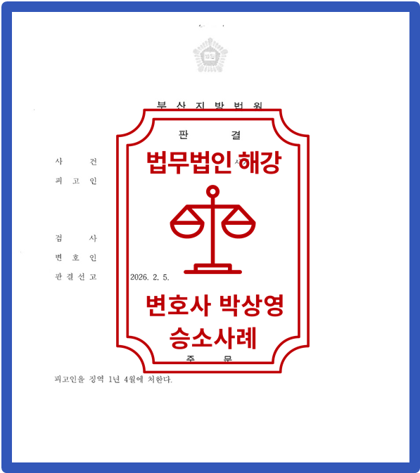 저희 법무법인 해강은 법리적인 검토를 통하여 의뢰인 상황에 맞춘 변호인 의견서 등 작성을 통하여 의뢰인을 위해 최선을 다하였고 이에 [성공]을 이끌어냈습니다.