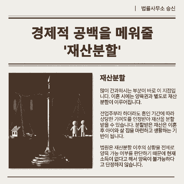 분할받은 재산은 이혼 후 아이와 살 집을 마련하고 생활하는 기반이 됩니다.