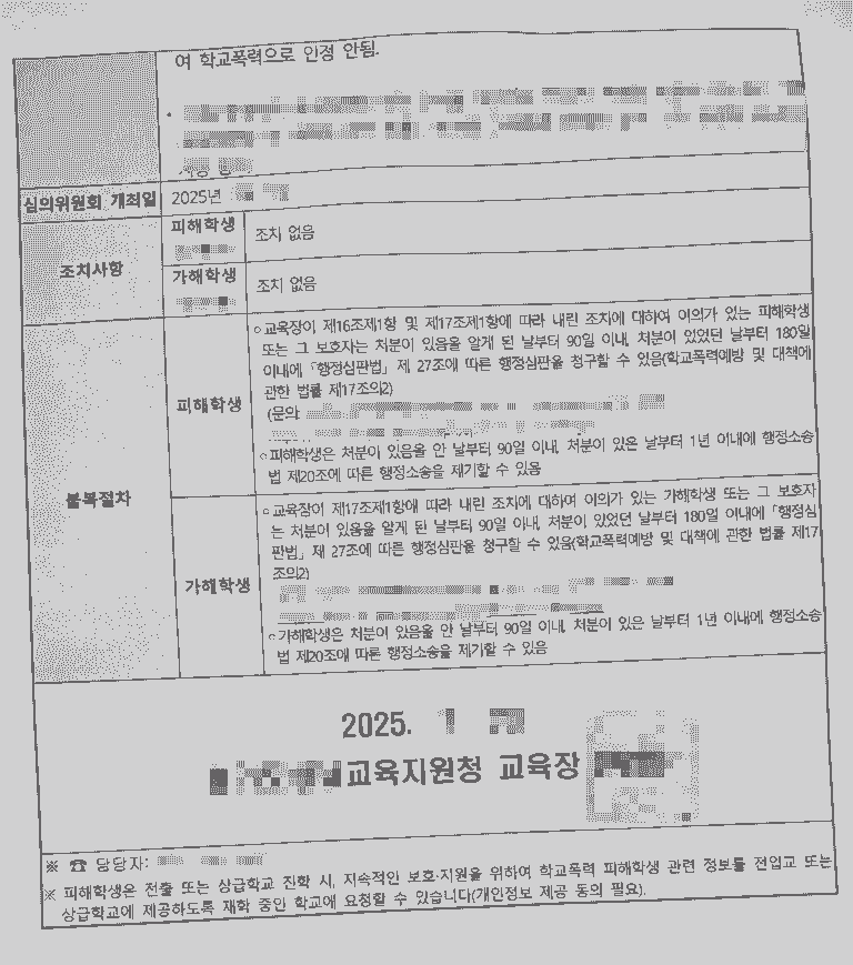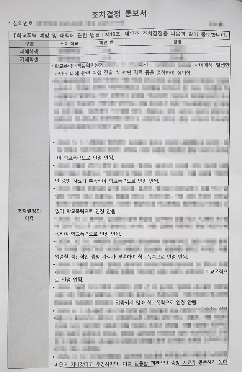저희가 주장한 대로, 모든 신고내용에 대해 학교폭력 불인정되어 최종적으로 "조치없음"결정이 나왔습니다. 의뢰인의 억울함을 풀어드릴 수 있어 참 뿌듯한 순간이었습니다.