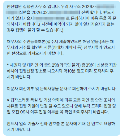 위와 같이 강제집행신청서를 작성해 집행관 사무소에 제출하면, 아래와 같이 문자가 와서 집행 일시와 장소, 방법 등을 안내해 줍니다.