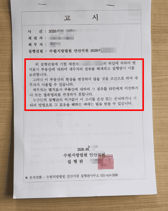 임차인이 문을 열어주지 않으면 열쇠기술자님이 문을 따서 들어가야 하는데, 다행히 임차인분이 문을 열어주셨고, 현관 바로 옆 벽면에 아래 사진과 같이 점유이전금지가처분 명령의 취지를 공시하였습니다.